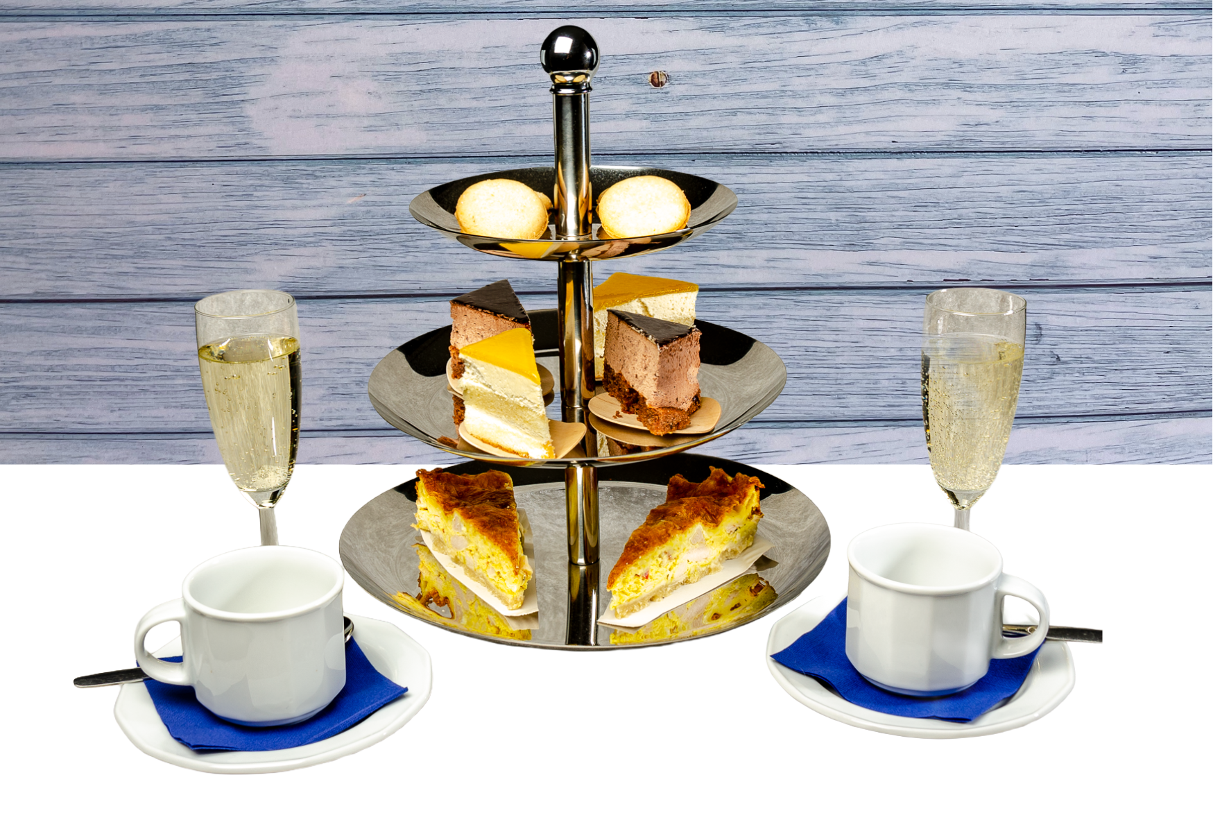 Sisältää kahdelle kahvi/tee, suolainen piirakka, leivoslajitelma, pikkuleipä tai tuulihattu sekä lasillinen alkoholitonta kuohuviiniä